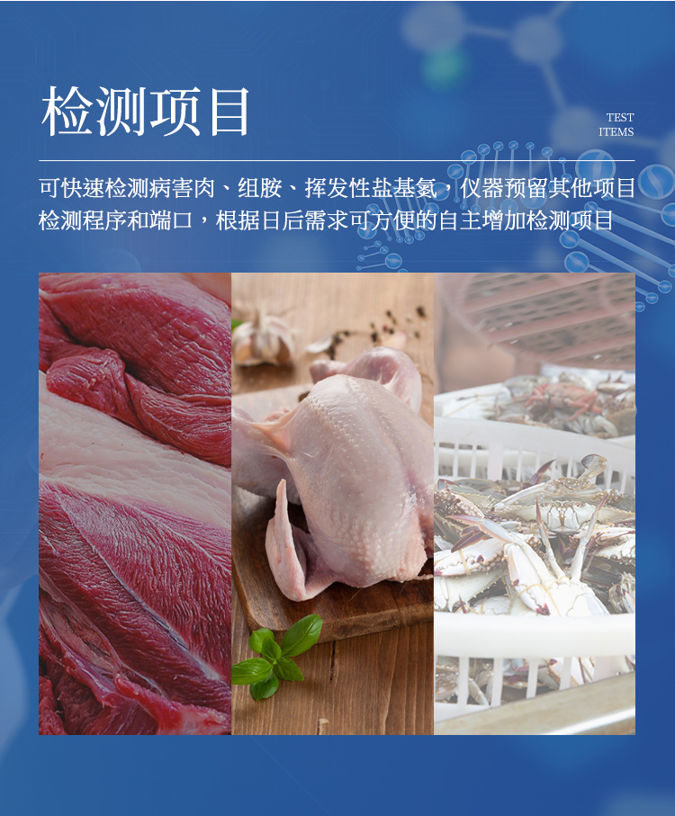 可快速檢測病害肉、組胺、揮發性鹽基氮,儀器預留其他項目檢測程序和端口,根據日后需求可方便的自主增加檢測項目。