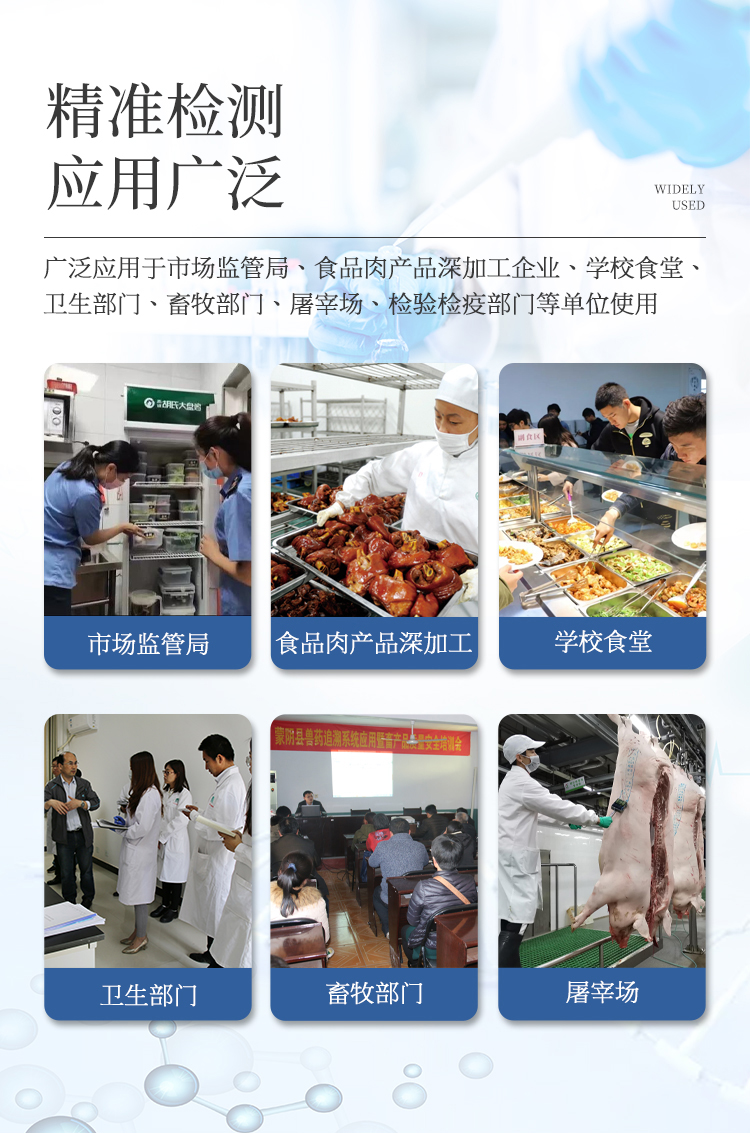 該多功能食品安全檢測儀為集成化食品安全快速檢測分析設備,廣泛應用于食藥監局、衛生部門、高教院校、科研院所、農業部門、養殖場、屠宰場、食品肉產品深加工企業、檢驗檢疫部門等單位使用。