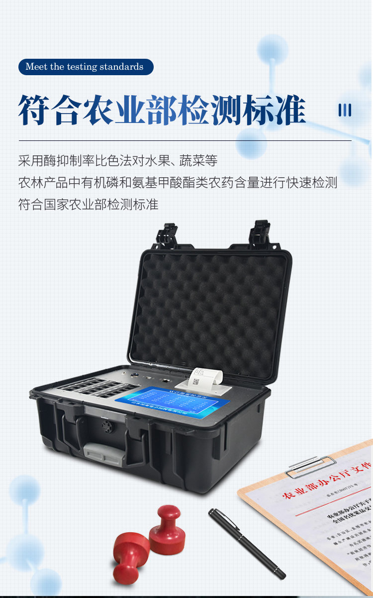 多功能農藥殘留檢測儀,除了遵循國標對有機磷和氨基甲酸酯類農藥進行檢測外,還可以針對具體農藥進行分項準確檢測,★包含吡蟲啉、噻蟲嗪、多菌靈、百菌清、克百威、毒死蜱、異丙威、啶蟲脒、氟蟲腈、水胺硫磷、甲萘威、三唑磷、百草枯、甲霜靈、殺螟硫磷、百菌清-多菌靈2合1、氟蟲腈-甲萘威2合1、甲基對硫磷、乙草胺、阿維菌素、有機磷、甲草胺、涕滅威、噻菌靈、三唑酮、氯吡脲、多效唑、氯噻啉、霜霉威、噻蟲啉、辛硫磷、氯氰菊酯、苯醚甲環(huán)唑、4-氯苯氧乙酸、2,4-二氯苯氧乙酸、2,4,5-三氯苯氧乙酸、6-芐基腺嘌呤、除草定、烯啶蟲胺、異菌脲、氟苯脲、腐霉利、甲氰菊酯、高效氯氟氰菊酯、二甲戊靈、氟節(jié)甲基異柳磷、噠螨靈、噻蟲胺、烯酰嗎啉、嘧菌酯、氟樂靈、嘧霉胺、三唑酮/三唑醇、滅蠅胺、戊唑醇、甲拌磷、氯蟲苯甲酰胺、二嗪磷、氧樂果、甲基吡啶磷、阿滅丁、雙甲脒等眾多殺蟲劑化合物。