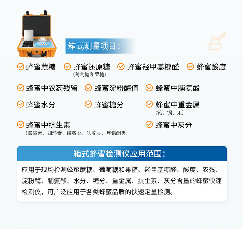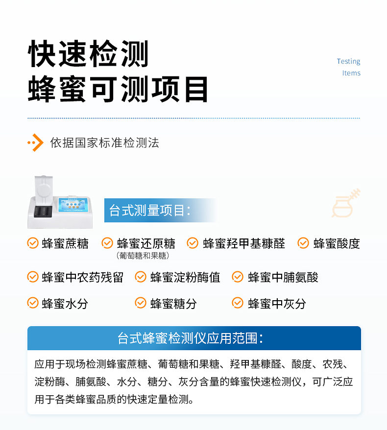 檢測項目:蜂蜜蔗糖、蜂蜜還原糖(葡萄糖和果糖)、蜂蜜羥甲基糠醛、蜂蜜酸度、蜂蜜中農藥殘留、蜂蜜淀粉酶值、蜂蜜中脯氨酸、蜂蜜水分、蜂蜜糖分、蜂蜜中灰分,應用范圍:應用于現場檢測蜂蜜蔗糖、葡萄糖和果糖、羥甲基糠醛、酸度、農殘、淀粉酶、脯氨酸、水分、糖分、灰分含量的蜂蜜快速檢測儀,可廣泛應用于各類蜂蜜品質的快速定量檢測。