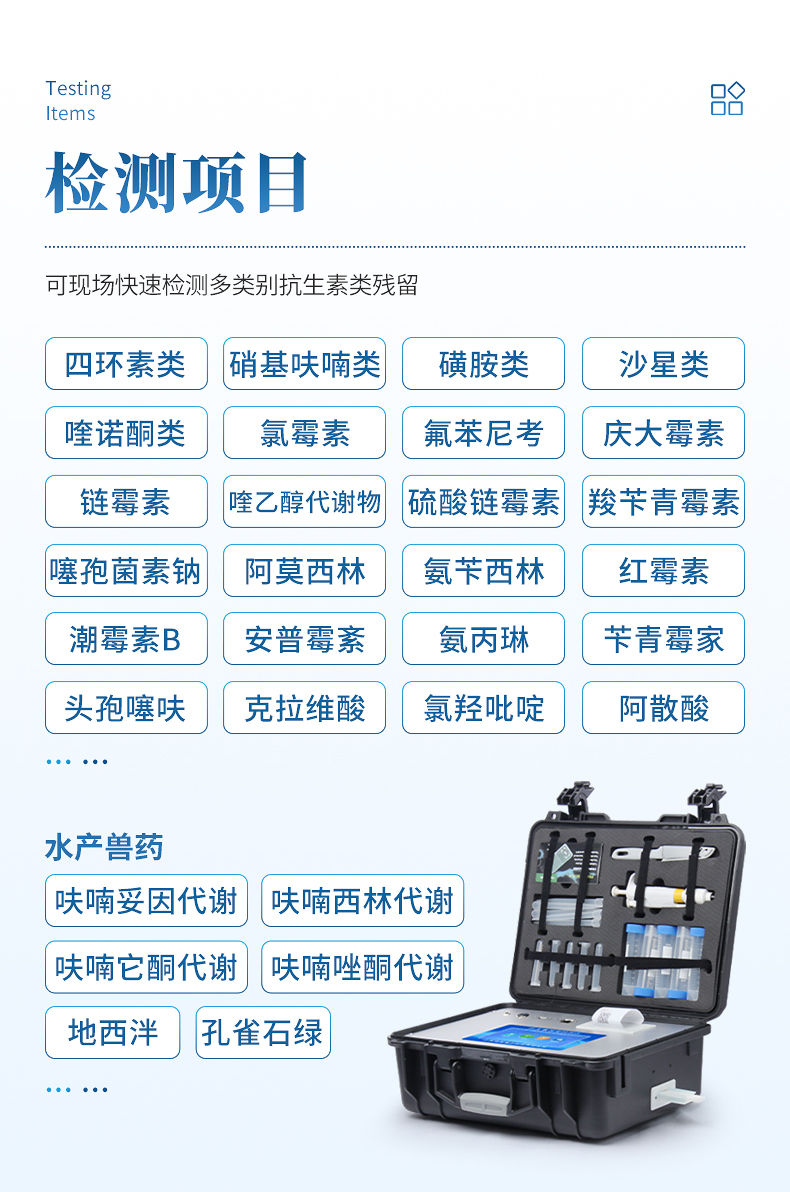 抗生素檢測儀可現場快速檢測抗生素類殘留、獸藥殘留、激素類殘留、毒素類殘留,化學類殘留等多種項目,如可快速檢測四環素類、硝基呋喃類、磺胺類、沙星類、喹諾酮類、氯霉素、慶大霉素、鏈霉素、喹乙醇代謝物、硫酸鏈霉素、羧芐青霉素、噻孢菌素鈉、阿莫西林、氨芐西林、紅霉素、潮霉素B、安普霉紊、桿菌肽等抗生素快速檢測;還可檢測激素類:鹽酸克倫特羅、沙丁胺醇、萊克多巴胺、己烯雌酚等,水產獸藥:呋喃妥因代謝、呋喃西林代謝、呋喃它酮代謝、呋喃唑酮代謝、孔雀石綠等,毒素類:黃曲酶毒素B1、嘔吐毒素、玉米赤霉烯酮、赭曲霉毒素A等,化學類藥物:氨丙琳、甲基吡啶磷、阿滅丁、雙甲脒、阿散酸、阿維菌素、氮哌酮、芐青霉家、頭孢噻呋、克拉維酸、氯羥吡啶等。