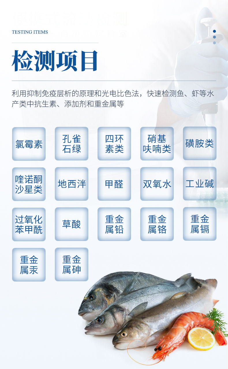 水產品檢測儀可快速檢測魚、蝦等水產類中的氯霉素、孔雀石綠、四環素類、硝基呋喃類、磺胺類、喹諾酮沙星類、氟苯尼考、土霉素、金霉素、甲砜霉素、地西泮等快速檢測,如氯霉素快速檢測卡整個檢測過程只需要30分鐘左右, 靈敏度為 0.3 μg/kg (ppb)。該快速檢測系統設備為集成化食品安全快速檢測分析設備,廣泛應用于農貿市場、海鮮市場、食品肉產品深加工企業、食藥監局、衛生部門、水產養殖場、檢驗檢疫部門、農業部門、第三方機構等單位使用。