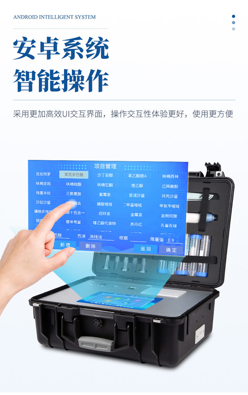 5、一體化便攜式快檢設備,滿足現場及流動檢測使用需求,能夠在同一軟件下實現所有檢測項目的檢測,并可通過同一窗口直觀顯示檢測結果。