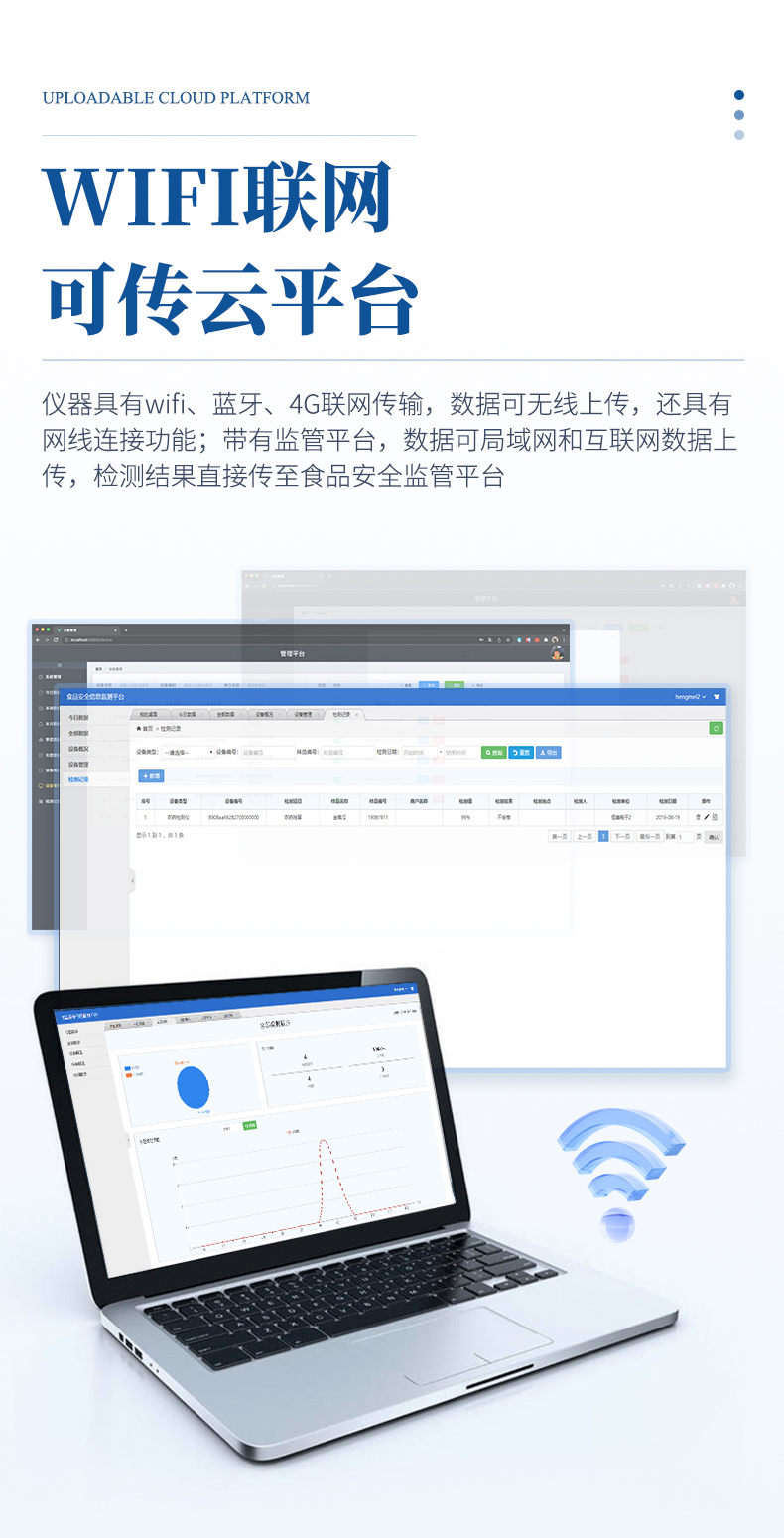 4、★儀器帶有監管平臺,數據可局域網和互聯網數據上傳,檢測結果直接傳至食品安全監管平臺。進行區域食品安全監管及大數據分析處理與數據統計,檢測區域食品安全長短期動態,達到食品安全問題預估、預警
