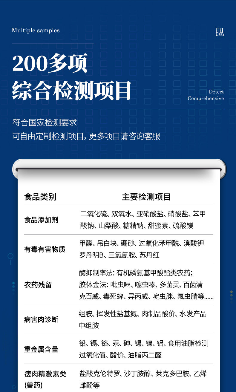 果蔬中:農(nóng)藥殘留,病害肉診斷:組胺、揮發(fā)性鹽基氮、肉制品酸價(jià)、水發(fā)產(chǎn)品中組胺