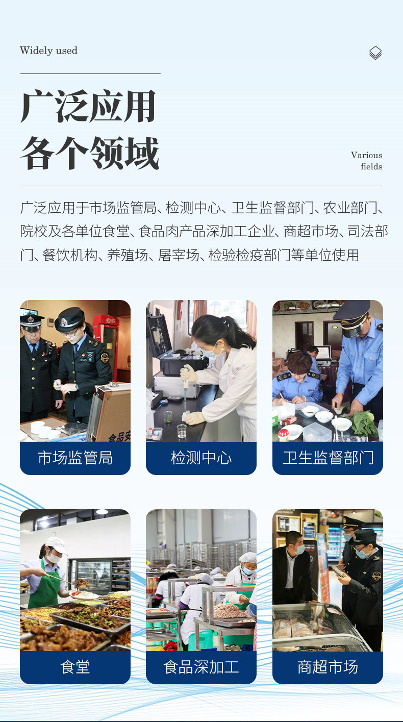 食品快速檢測儀器可快速檢測200多項(xiàng)目,包含非食用化學(xué)物質(zhì)、濫用食品添加劑、農(nóng)藥殘留、獸藥殘留、重金屬、病害肉、營養(yǎng)強(qiáng)化劑、抗生素類殘留、激素類殘留、真菌毒素類殘留、化學(xué)類殘留等現(xiàn)場的定性定量檢測。