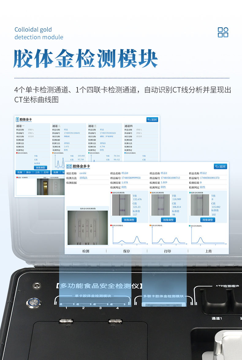 5、★膠體金檢測模塊,4個單卡檢測通道、1個四聯卡檢測通道,自動識別CT線分析并呈現出CT坐標曲線圖。