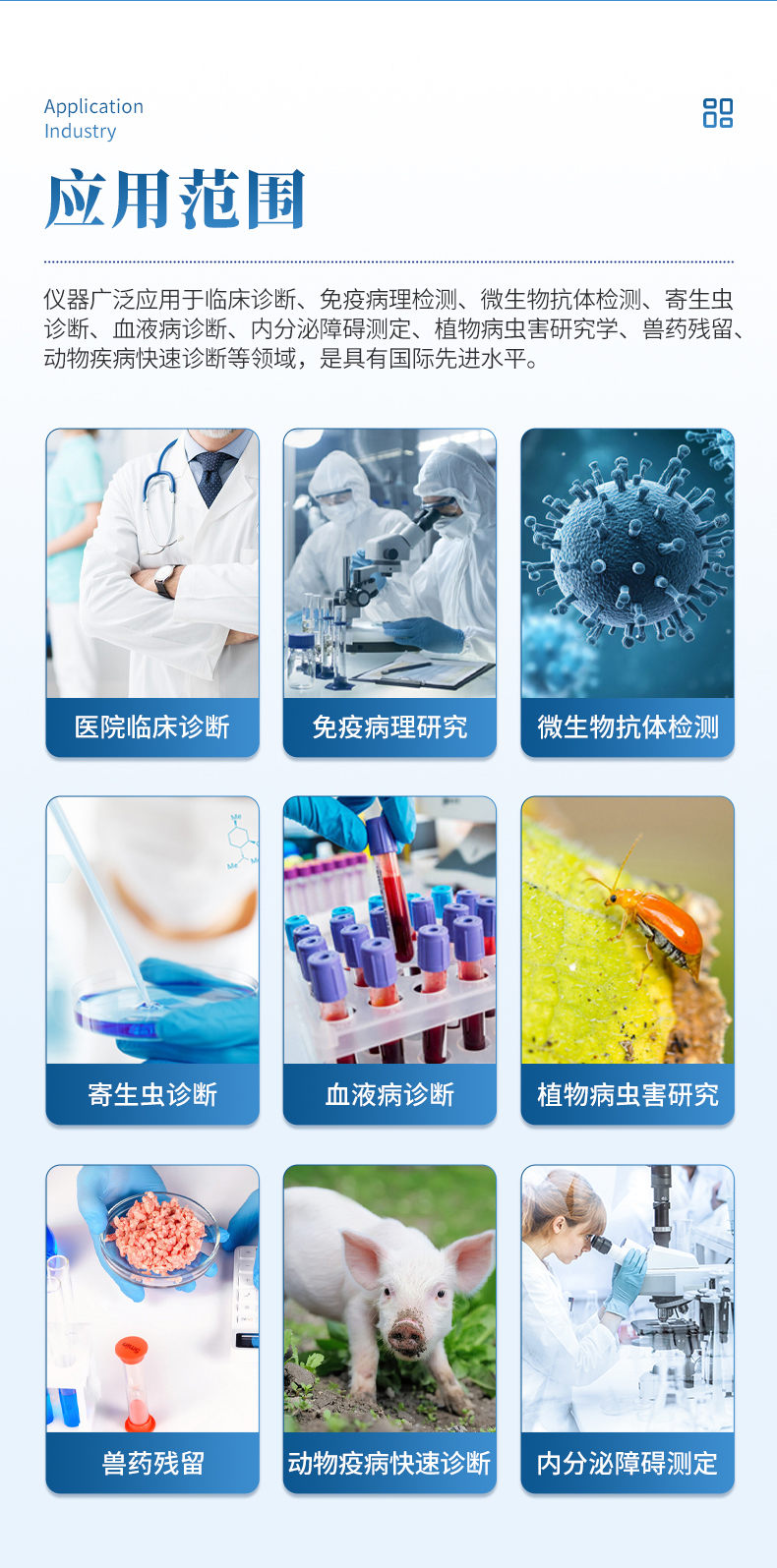 HM-SY96S動(dòng)物疫病診斷儀是我公司在新推出的一款全新檢測儀器,該系統(tǒng)采用酶聯(lián)免疫吸附測定法與相應(yīng)試劑配合可定性或定量進(jìn)行動(dòng)物疫病快速診斷。如:豬藍(lán)耳病毒、豬瘟病毒、豬偽狂犬病毒、豬偽狂犬病毒gE蛋白、豬圓環(huán)病毒、豬乙型腦炎病毒、豬口蹄疫3ABC蛋白、豬口蹄疫病毒IgG、豬細(xì)小病毒、雞禽流感、藍(lán)舌病、白斑綜合征、牛傳染性胸膜肺炎、牛瘟、綿羊痘和山羊痘等等疫病檢測,并可根據(jù)客戶需要定制項(xiàng)目。