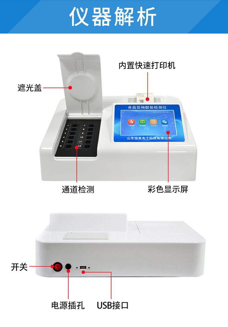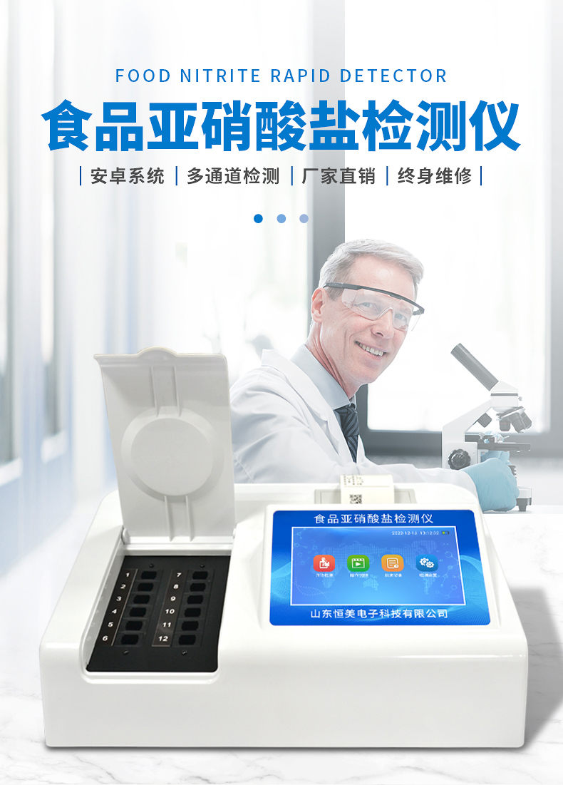 HM-Y12食品中亞硝酸鹽檢測儀器為集成化食品安全檢測分析設備,能夠快速檢測肉類、肉類罐頭、熏肉、香腸、奶制品、泡菜、腌制蔬菜等中的亞硝酸鹽含量;該儀器是根據GB5009.33-2010《食品中亞硝酸鹽與硝酸鹽的測定》,食品中的亞硝酸鹽經過提取,與檢測試劑反應生成有色化合物,再利用亞硝酸鹽檢測儀測定其吸光度,在一定范圍內吸光度與含量成正比。通過檢測可確定食品是否符合國家標準或是否為超標毒害食品等。儀器預留其他項目檢測程序和端口,根據日后需求可方便的自主增加檢測項目。日后可升級為檢測水產品、面制品的綜合類型儀器。