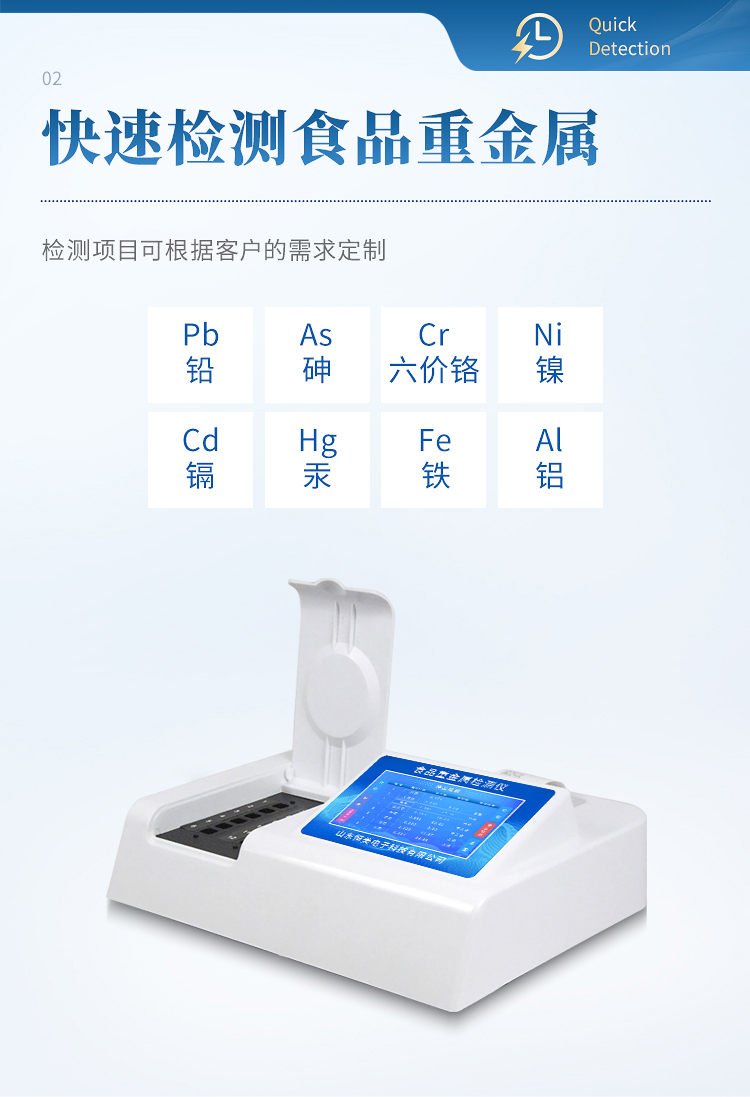 食品重金屬檢測儀可廣泛應(yīng)用于大米、糧谷、果品、蔬菜、藥材、水質(zhì)、水產(chǎn)品中重金屬鉛、鎘、六價鉻、汞、砷、鐵、鎳、鋁的快速檢測,檢測項(xiàng)目可根據(jù)客戶的需求定制。