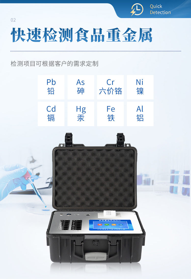 食品重金屬快速檢測儀可廣泛應用于大米、糧谷、果品、蔬菜、藥材、水質、水產品中重金屬鉛、鎘、六價鉻、汞、砷、鐵、鎳、鋁的快速檢測,檢測項目可根據客戶的需求定制。